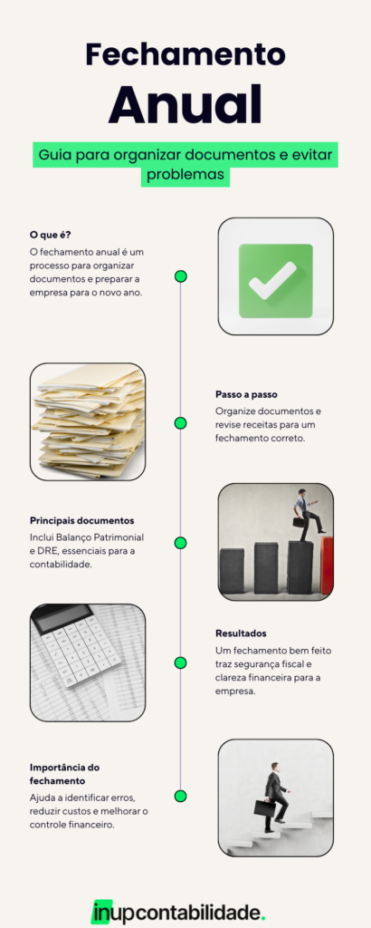 O fechamento anual consiste em reunir e revisar todas as informações financeiras do ano, como movimentações bancárias, notas fiscais, obrigações fiscais e relatórios contábeis.